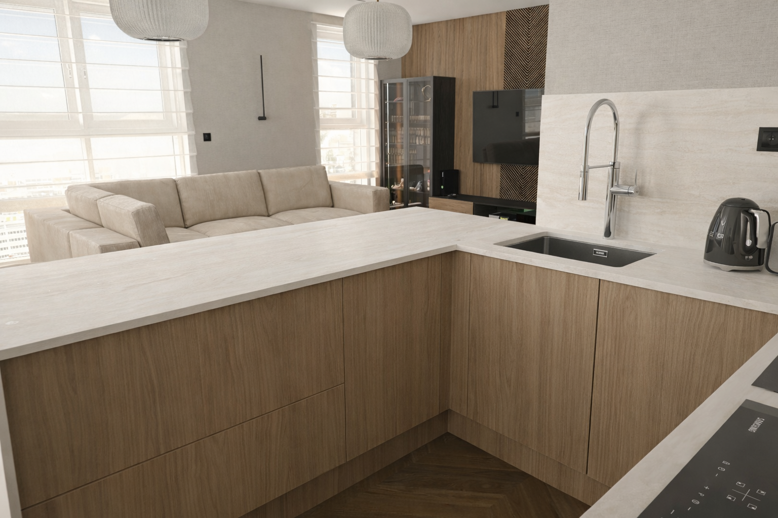 Salon Japandi z otwartą kuchnią – jasne drewno, beże i wyspa kuchenna OptimumArt