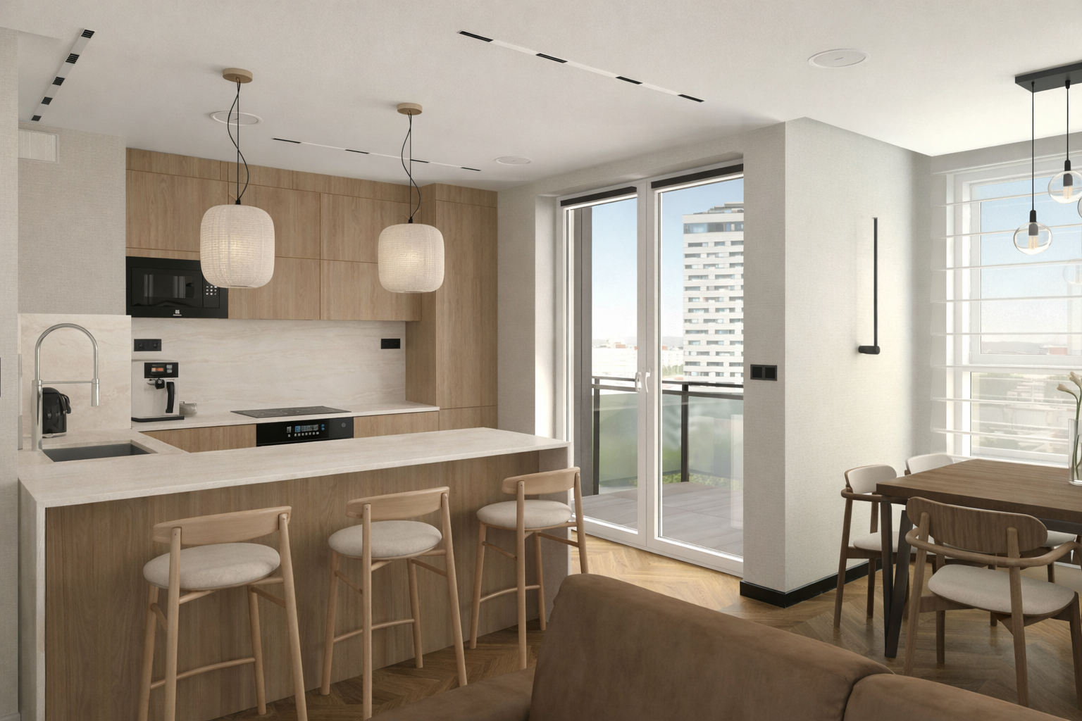 Strefa dzienna została otwarta na kuchnię i jadalnię. Centralnym elementem kuchni jest duża wyspa z jasnym, kamiennym blatem, która pełni rolę miejsca do gotowania i spotkań. Fronty w ciepłym drewnie oraz proste, minimalistyczne formy wpisują się w estetykę Japandi, a wysokie przeszklenia i delikatne rolety wpuszczają dużo naturalnego światła.