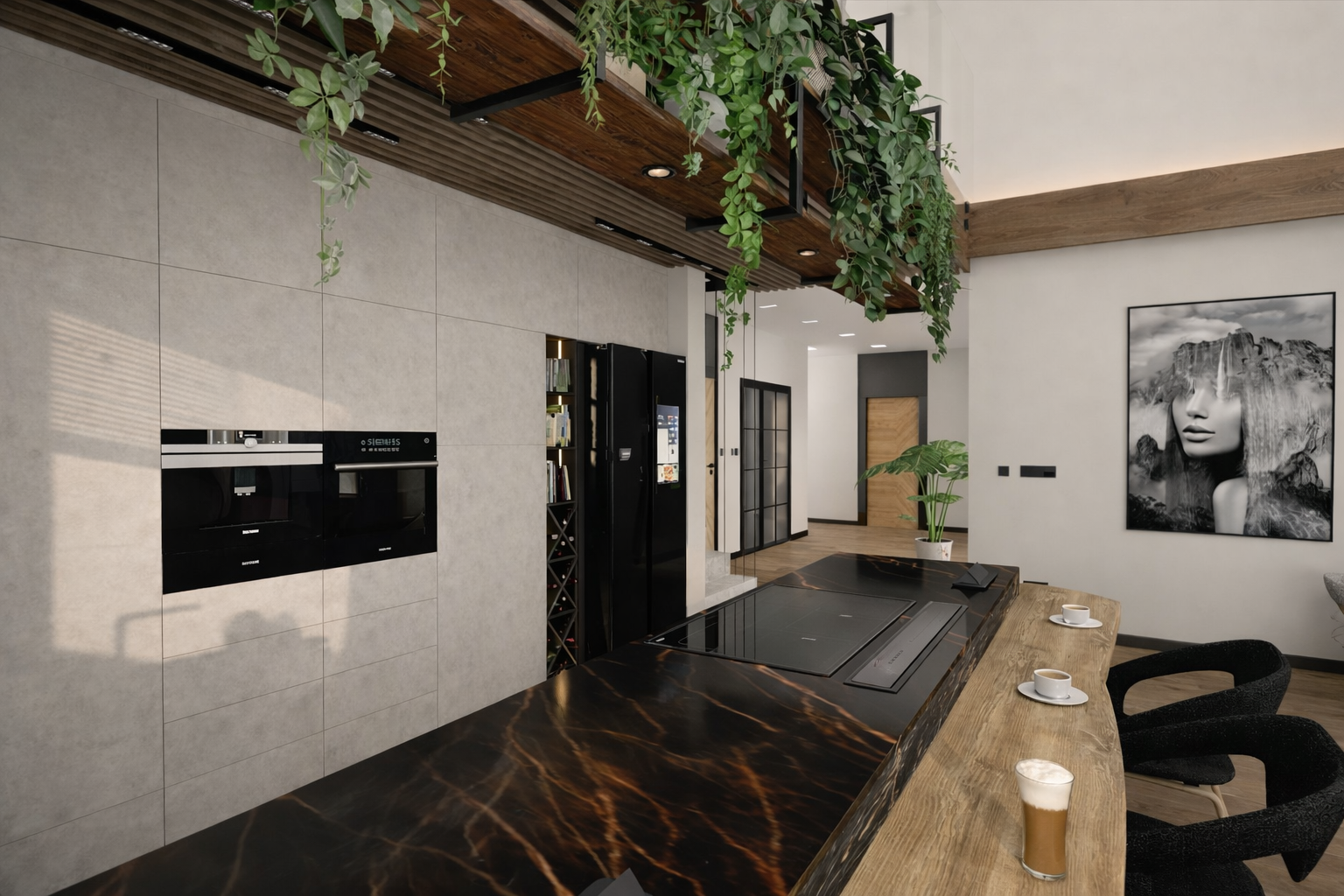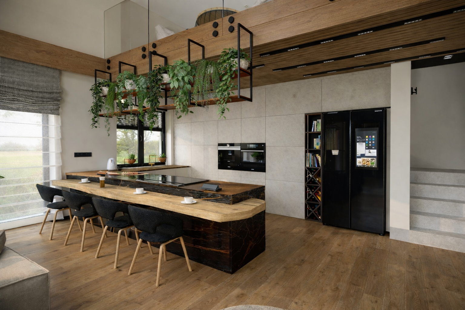 Centralnym punktem aranżacji jest kuchnia z dużą wyspą wykończoną ciemnym kamieniem i blatem z drewna. To miejsce do wspólnego gotowania, rozmów i codziennych rytuałów. Nad strefą jadalnianą pojawia się masywny stół z naturalnego drewna, a całość spina spójna paleta barw i konsekwentne detale: czarne oprawy, grafitowe tkaniny i mocna, kontrastowa zabudowa.