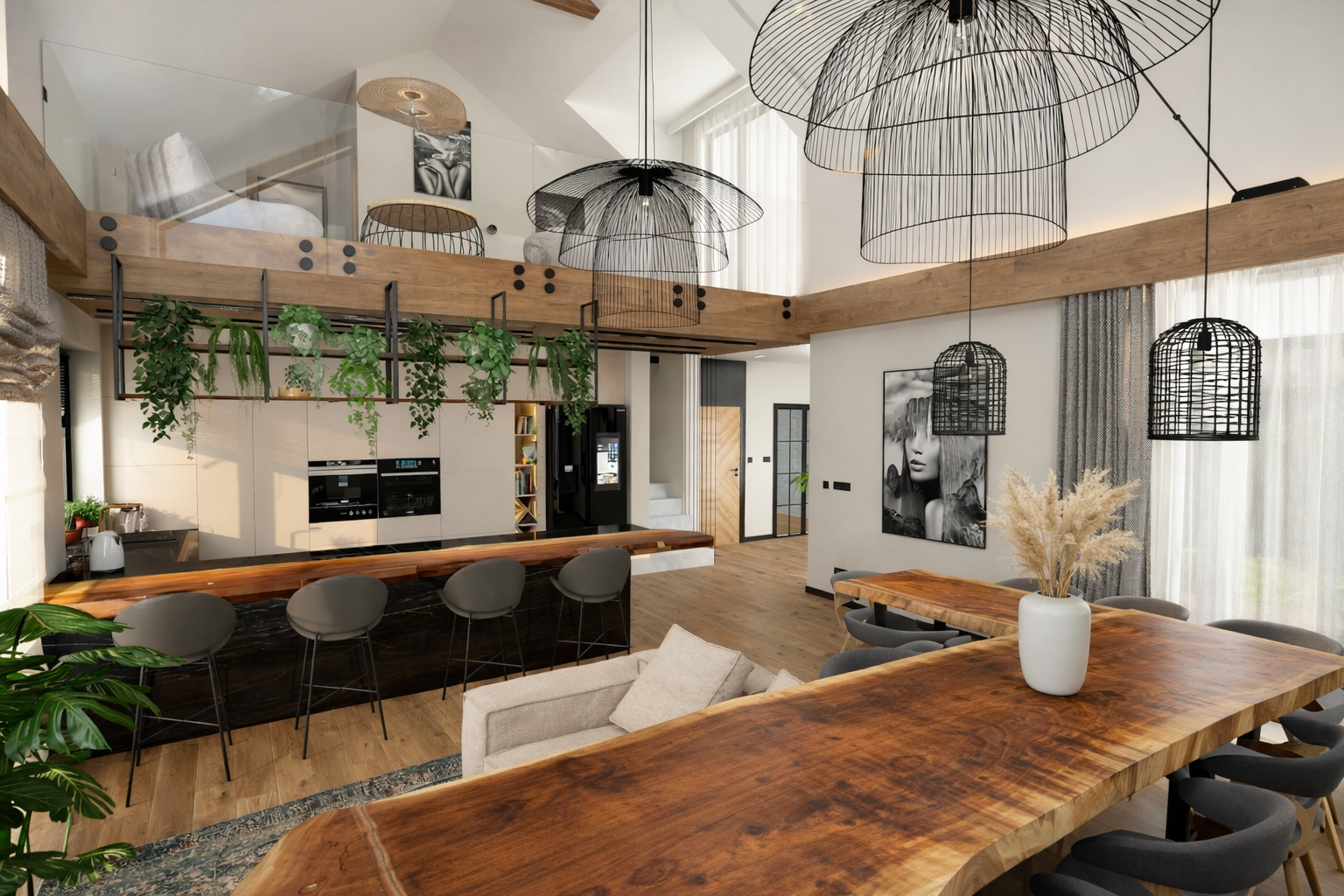 Ten projekt wnętrza nowoczesnej stodoły to wyraziste połączenie loftowej przestrzeni, naturalnych materiałów i dopracowanych detali. Wysokie wnętrze z antresolą pozwoliło stworzyć spektakularny open space z kuchnią, jadalnią i salonem, w którym główną rolę grają: drewno o mocnym rysunku, czerń, kamień z żyłowaniem oraz stalowe akcenty. Całość uzupełniają rośliny i nastrojowe oświetlenie, które budują klimat nowoczesnego domu z charakterem.