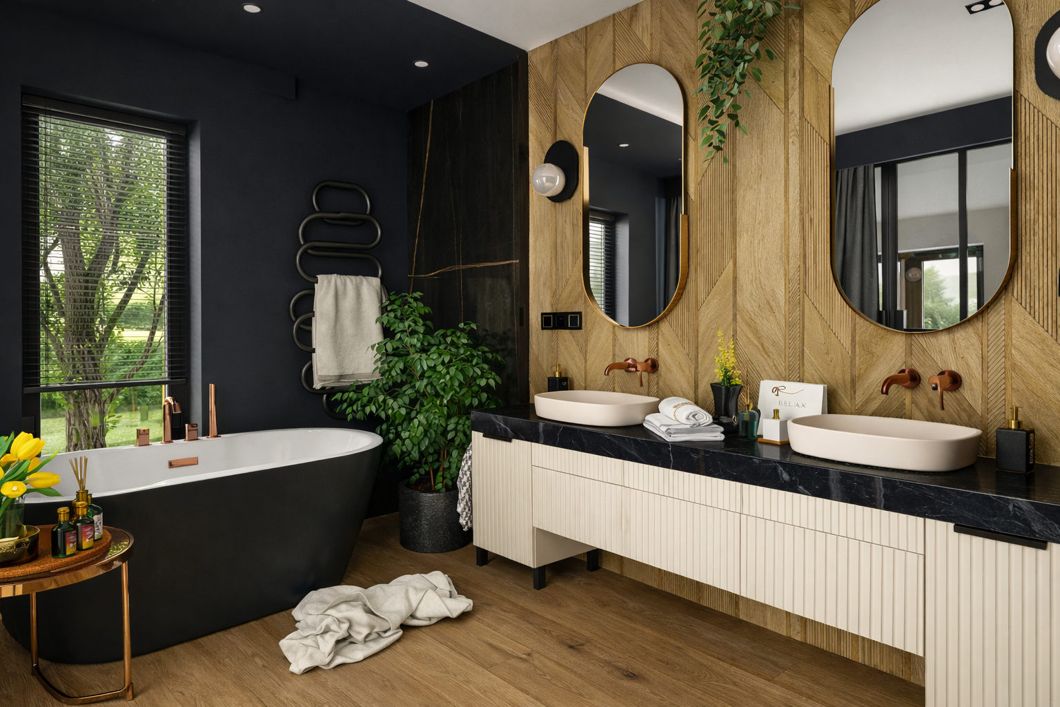 Łazienka jest mocna i stylowa: czarne, wielkoformatowe płytki, przeszklony prysznic walk-in, wolnostojąca wanna oraz armatura w ciepłym metalicznym odcieniu (miedź/złoto) tworzą efekt wnętrza premium. Drewniane okładziny i lustra o miękkich kształtach równoważą ciemną bazę, a rośliny dodają naturalnego akcentu.To projekt dla osób, które lubią odważne, nowoczesne wnętrza: z charakterem, kontrastem i świetnie przemyślaną funkcją.