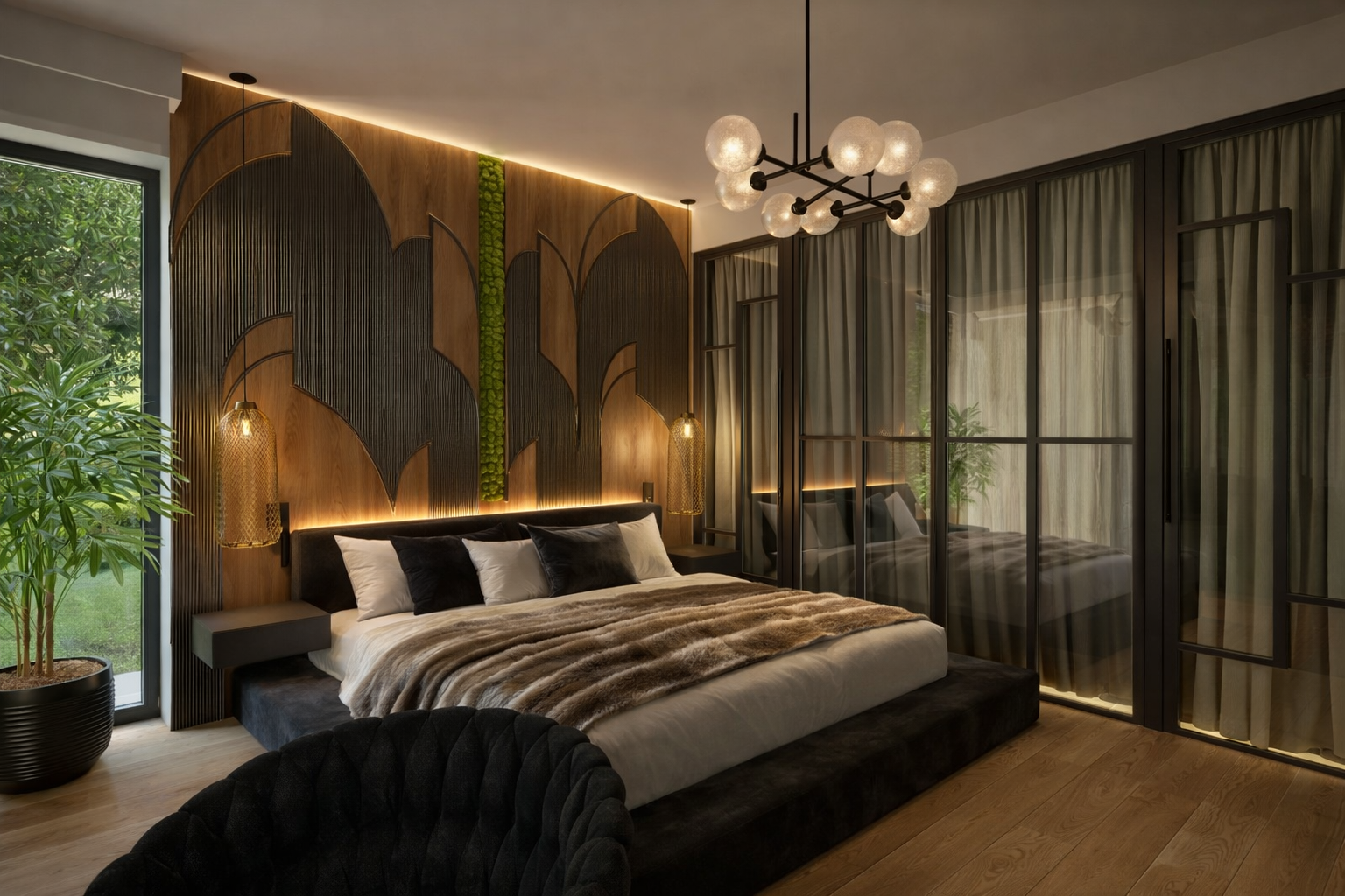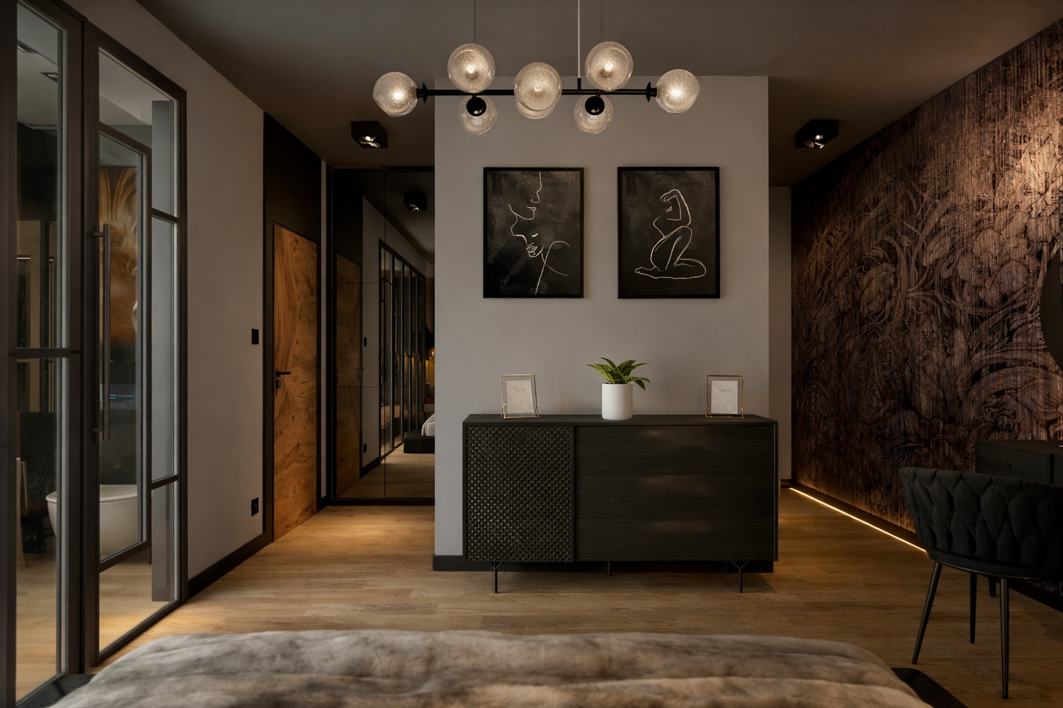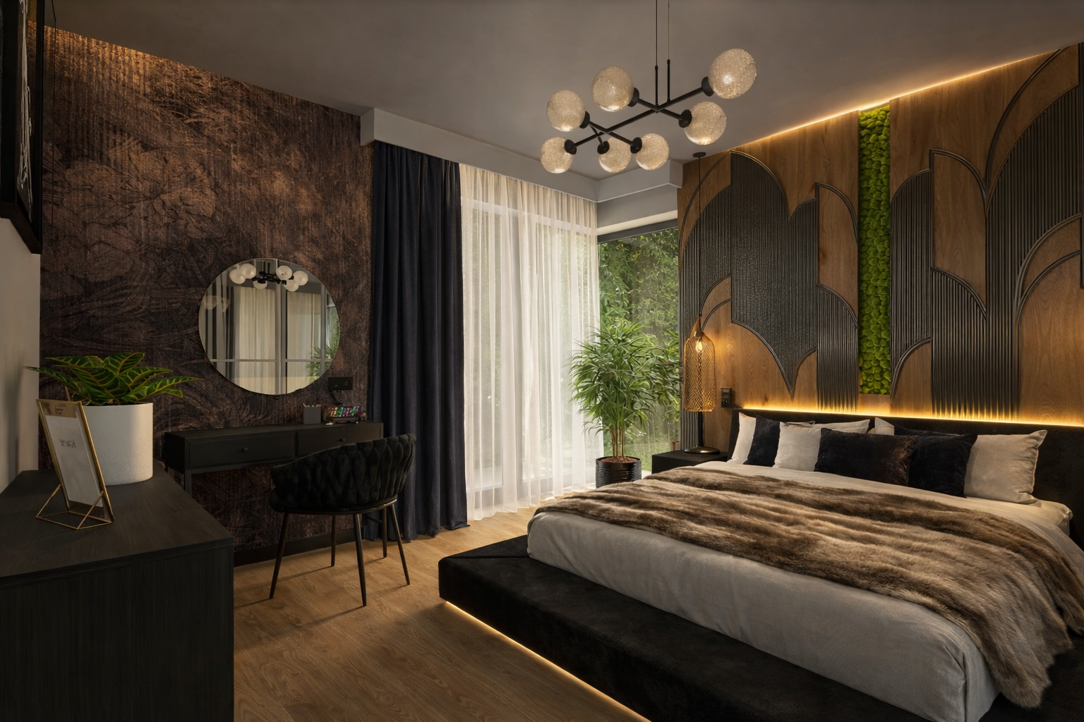 Sypialnia została zaprojektowana w klimacie nowoczesnego hotelu: dominują ciemniejsze tony, faktury i dekoracyjna ściana za łóżkiem z podświetleniem, która nadaje wnętrzu głębi. Przestrzeń do pracy/toaletka z lustrem oraz dopracowane oświetlenie sufitowe tworzą wygodną, elegancką strefę prywatną.