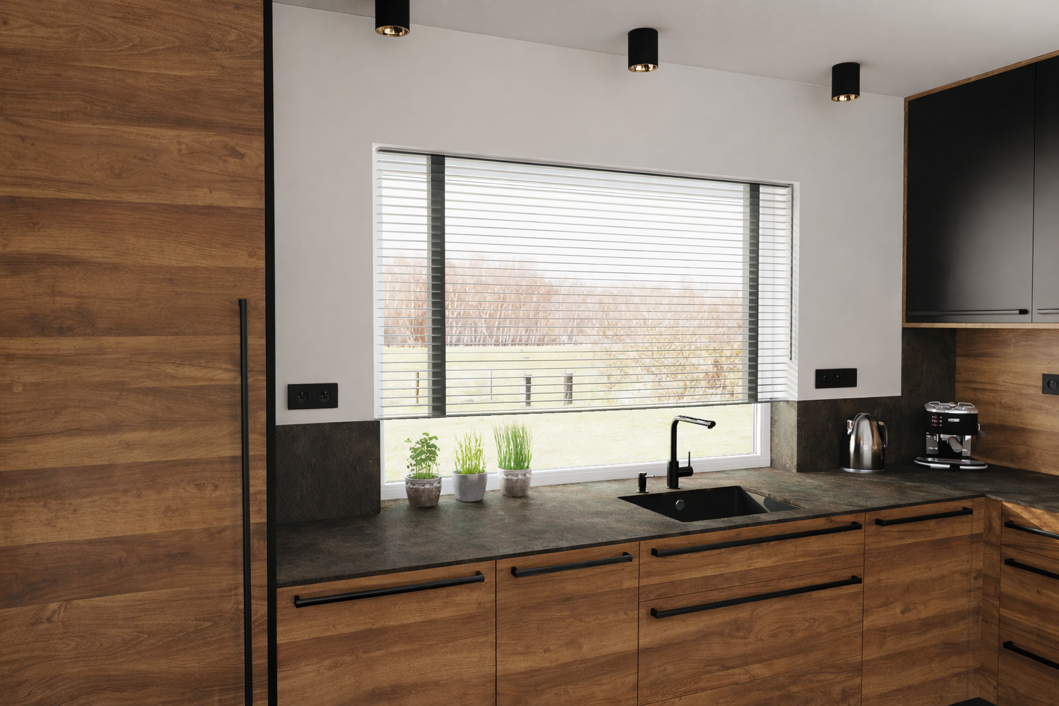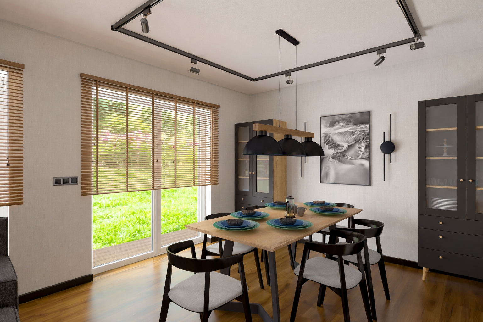 W jadalni i salonie utrzymaliśmy tę samą paletę barw: drewno, czerń i neutralne tło. Oświetlenie szynowe zwiększa elastyczność aranżacji, a mocnym elementem dekoracyjnym jest geometryczna ściana TV w ciemnym wykończeniu, która porządkuje przestrzeń i buduje nowoczesną kompozycję. Naturalne światło i drewniane żaluzje podkreślają przytulność wnętrza, zachowując jednocześnie nowoczesny klimat.