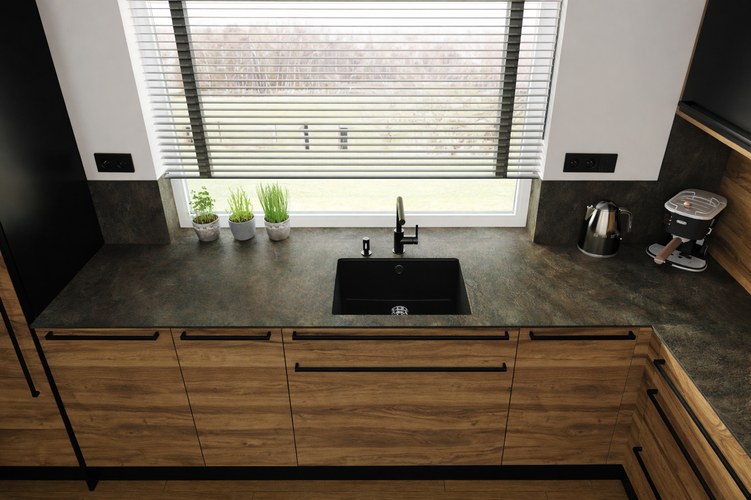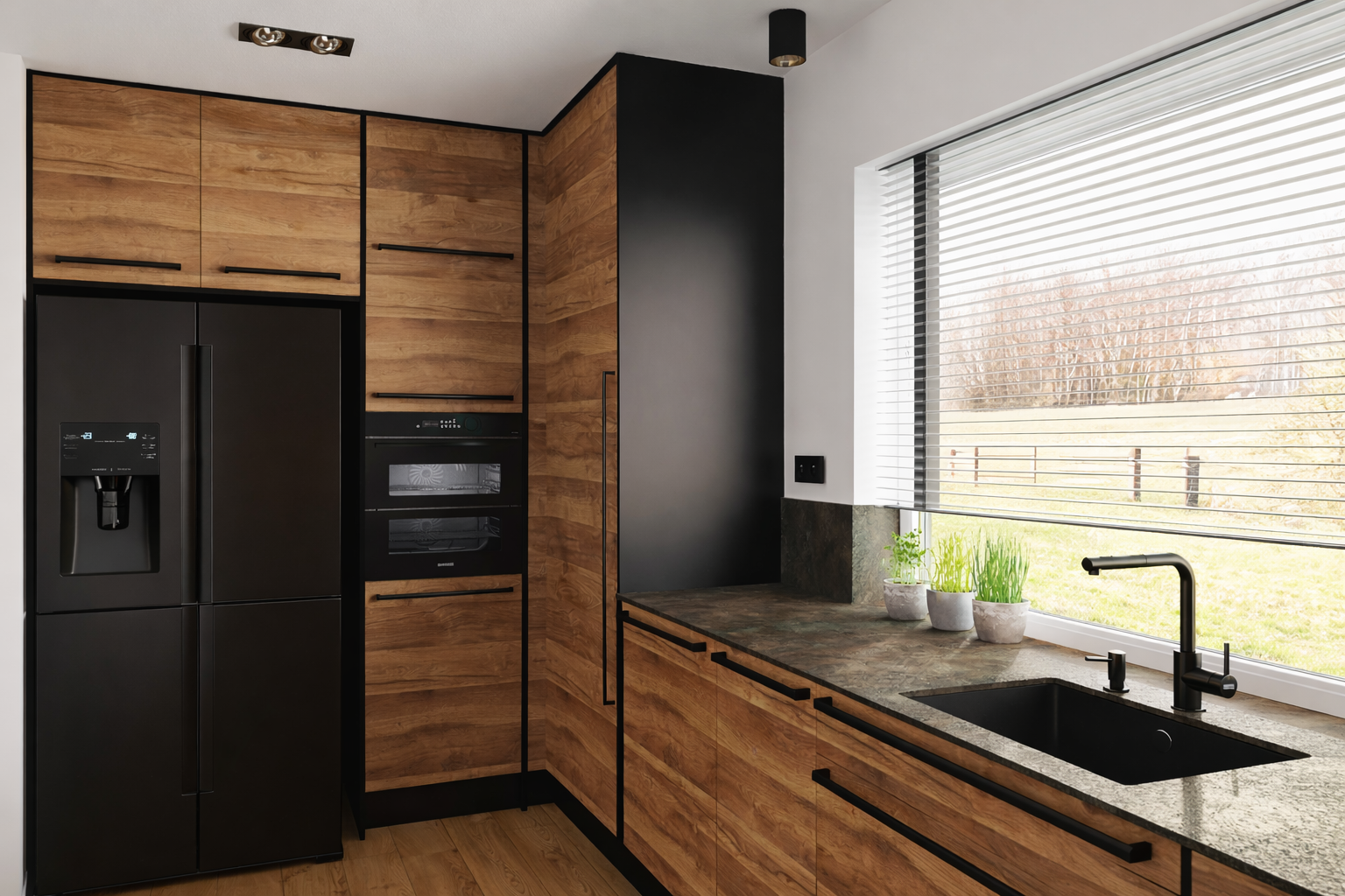 Kuchnia została zaprojektowana jako funkcjonalna zabudowa z wyraźnym podziałem na strefy. Drewniane fronty ocieplają przestrzeń, a czarne akcenty (m.in. wysoka zabudowa, uchwyty, armatura i zlew) nadają całości nowoczesny, wyrazisty charakter. Całość dopełnia ciemny blat o kamiennym rysunku oraz prosta, minimalistyczna oprawa oświetleniowa.